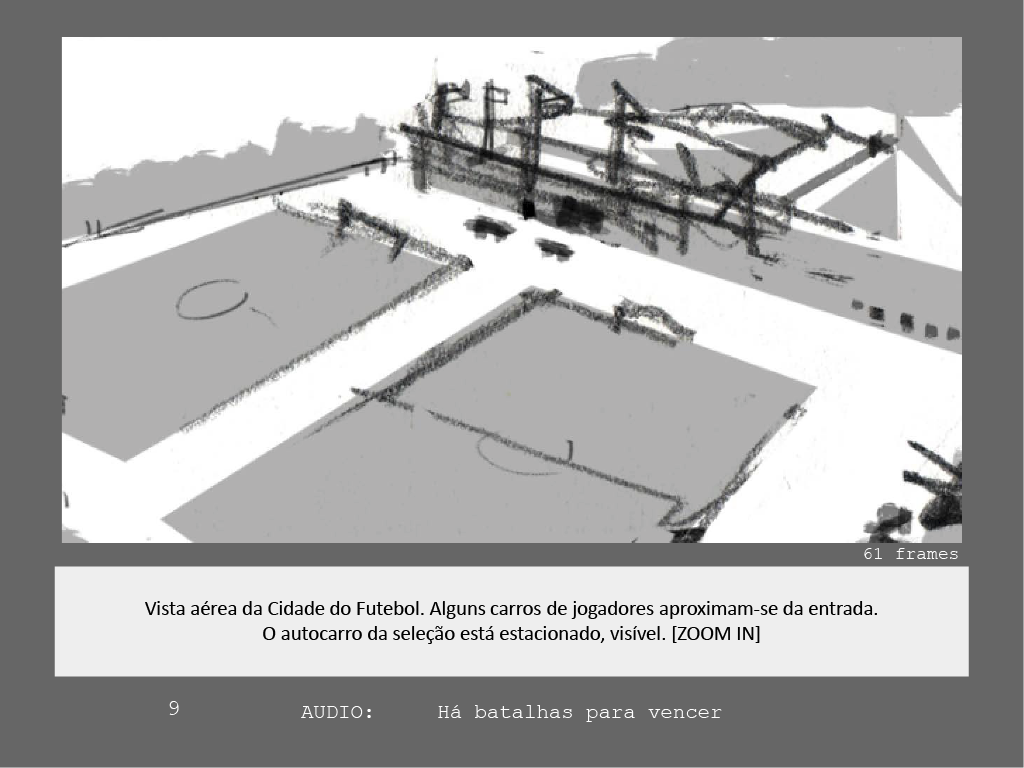 While João Lopes da Silva [Sardinha em Lata] was working on graphic development, Manel Sacadura [Homy Animation] took charge of setting the action, drawing storyboard and producing the animatic. Then followed a frantic animation-making phase for a numerous team of animators set by Sardinha Em Lata. We contributed with the 3D ball/ goal net shots, and mainly with great lot of after-effects animation, compositing and effects.