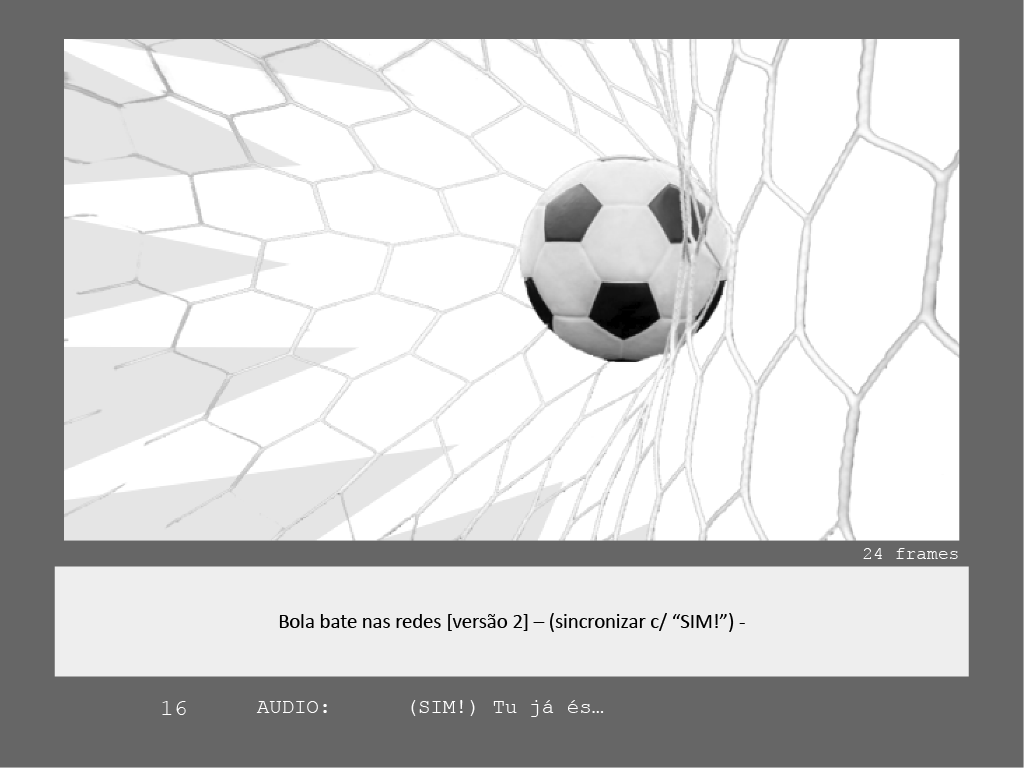 While João Lopes da Silva [Sardinha em Lata] was working on graphic development, Manel Sacadura [Homy Animation] took charge of setting the action, drawing storyboard and producing the animatic. Then followed a frantic animation-making phase for a numerous team of animators set by Sardinha Em Lata. We contributed with the 3D ball/ goal net shots, and mainly with great lot of after-effects animation, compositing and effects.
