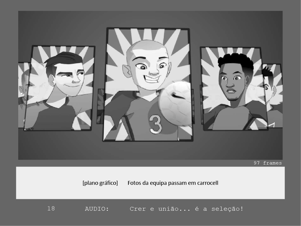 While João Lopes da Silva [Sardinha em Lata] was working on graphic development, Manel Sacadura [Homy Animation] took charge of setting the action, drawing storyboard and producing the animatic. Then followed a frantic animation-making phase for a numerous team of animators set by Sardinha Em Lata. We contributed with the 3D ball/ goal net shots, and mainly with great lot of after-effects animation, compositing and effects.