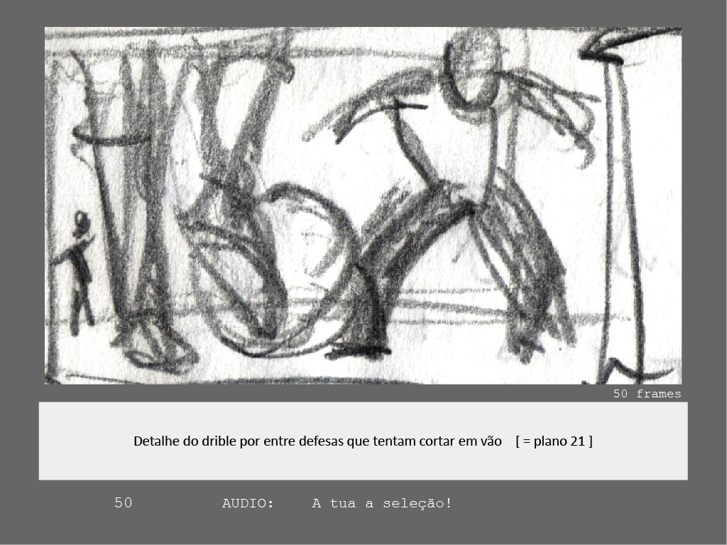 While João Lopes da Silva [Sardinha em Lata] was working on graphic development, Manel Sacadura [Homy Animation] took charge of setting the action, drawing storyboard and producing the animatic. Then followed a frantic animation-making phase for a numerous team of animators set by Sardinha Em Lata. We contributed with the 3D ball/ goal net shots, and mainly with great lot of after-effects animation, compositing and effects.