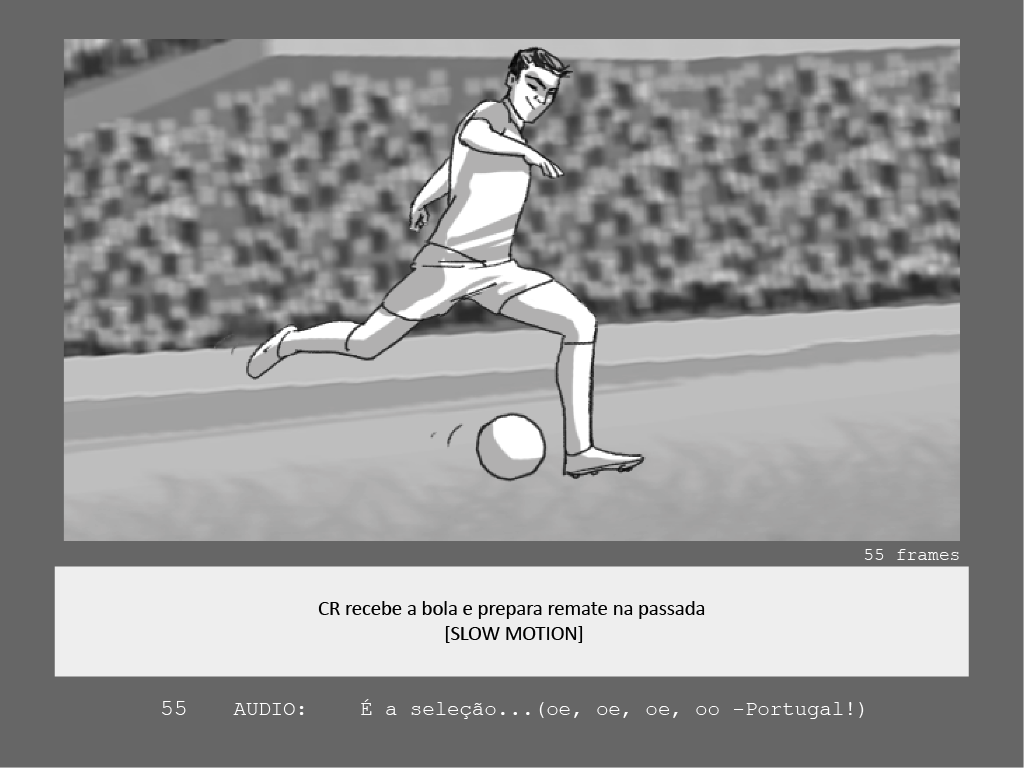 While João Lopes da Silva [Sardinha em Lata] was working on graphic development, Manel Sacadura [Homy Animation] took charge of setting the action, drawing storyboard and producing the animatic. Then followed a frantic animation-making phase for a numerous team of animators set by Sardinha Em Lata. We contributed with the 3D ball/ goal net shots, and mainly with great lot of after-effects animation, compositing and effects.