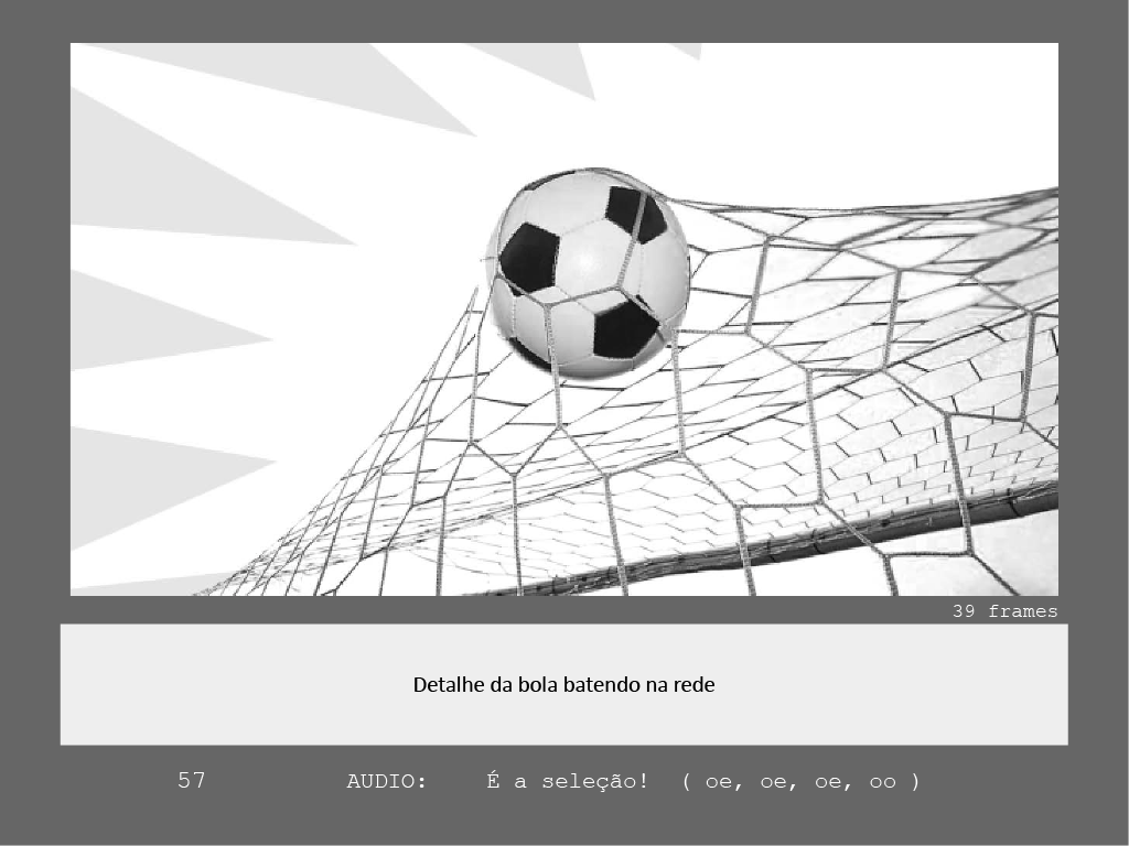 While João Lopes da Silva [Sardinha em Lata] was working on graphic development, Manel Sacadura [Homy Animation] took charge of setting the action, drawing storyboard and producing the animatic. Then followed a frantic animation-making phase for a numerous team of animators set by Sardinha Em Lata. We contributed with the 3D ball/ goal net shots, and mainly with great lot of after-effects animation, compositing and effects.