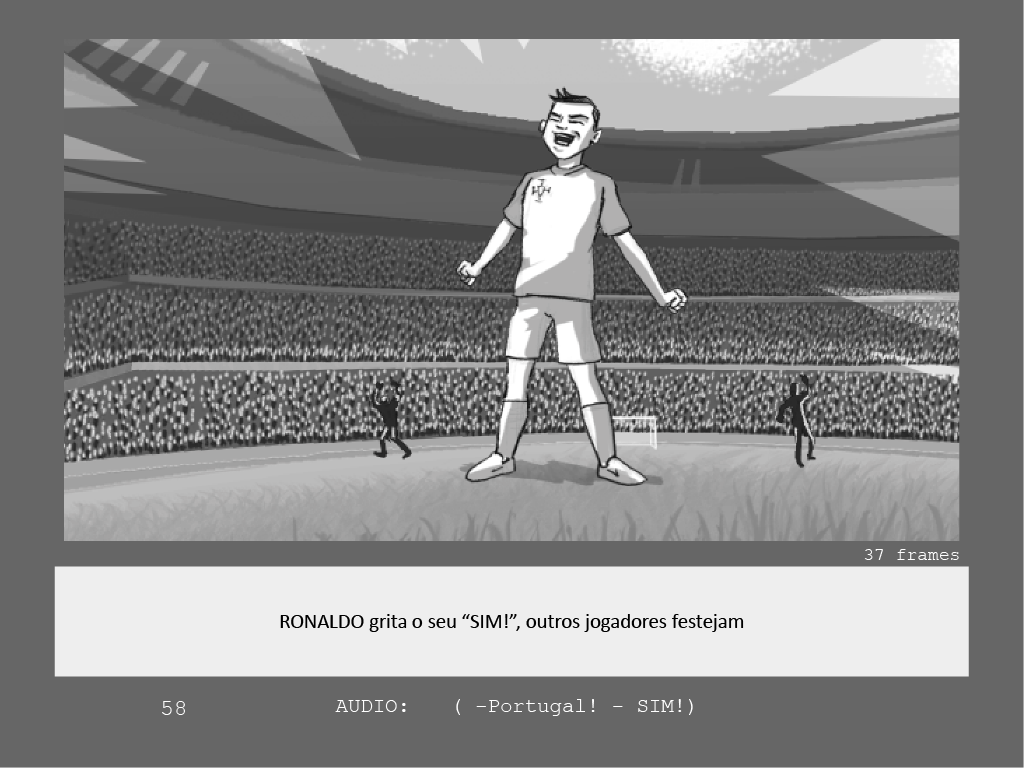 While João Lopes da Silva [Sardinha em Lata] was working on graphic development, Manel Sacadura [Homy Animation] took charge of setting the action, drawing storyboard and producing the animatic. Then followed a frantic animation-making phase for a numerous team of animators set by Sardinha Em Lata. We contributed with the 3D ball/ goal net shots, and mainly with great lot of after-effects animation, compositing and effects.